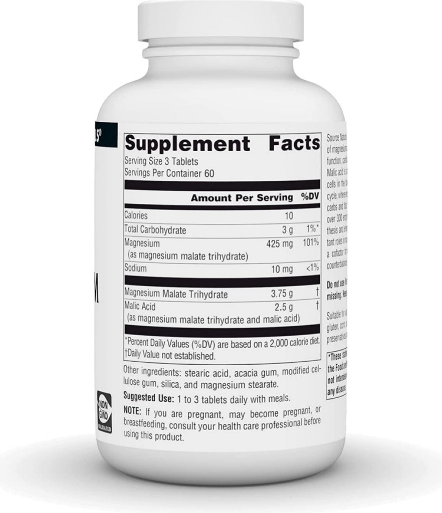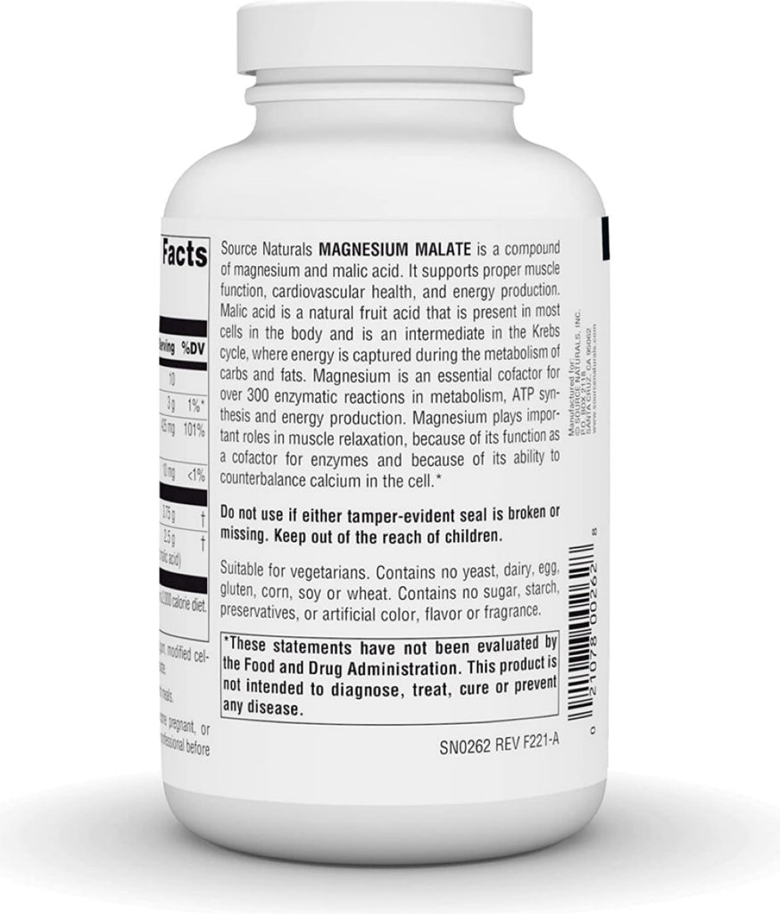 Source Naturals Magnesium Malate is a compound of magnesium and malic acid. Malic acid is a natural fruit acid that is present in most cells in the body and is an important component of numerous enzymes key to ATP synthesis and energy production. Magnesium is an essential mineral in over 300 enzymatic reactions in metabolism. Preliminary studies suggest that magnesium malate supports the body's own body cleansing of aluminum in the brain.
