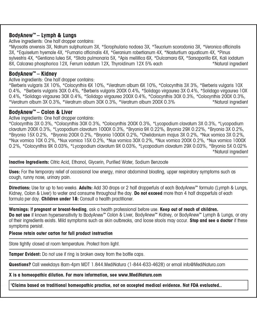 Use for up to two weeks. Adults: Add 30 drops or 2 half dropperfuls of each BodyAnew™ formula (Lymph & Lungs, Kidney, Colon & Liver) to water and consume throughout the day. Do not exceed more than 4 half dropperfuls of each formula per day. Children under 18: Consult a health practitioner.