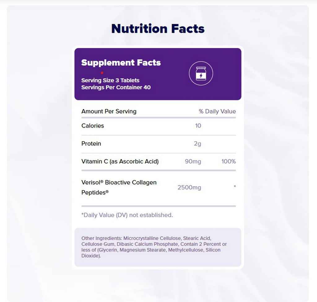This powerful formula contains Verisol® Collagen Peptides, bioactive collagen peptides that stimulate your body's natural collagen production and have been clinically studied to minimize wrinkles, and improve skin elasticity, firmness and tone. Additionally, Vitamin C helps facilitate cell production and acts as a free radical scavenger to protect cells from oxidative stress.