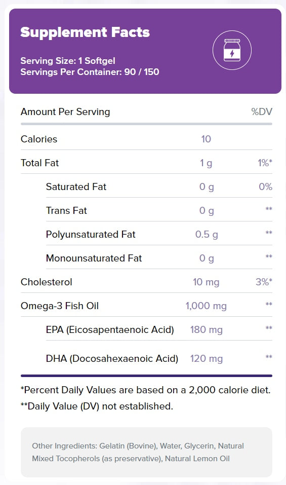 Give yourself the benefits of "good fats" with Natrol Omega-3 Fish Oil. With 1,000 mg of healthy, purified fish oil, you can provide your body with a healthy balance of the nutrients your body needs to support eye, heart and bone health. A source of EPA and DHA, Natrol® Omega-3 can help you achieve optimum health when added to your daily regimen.