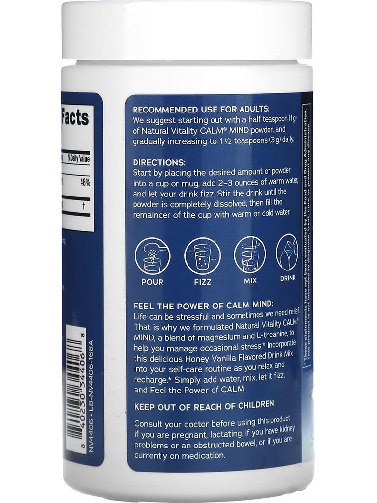 CALM MIND honey vanilla flavored powder drink mix is a magnesium supplement with L-theanine to support calming, a healthy response to stress and balanced mood. Simply stir with water, let fizz and drink to support a sense of calm.