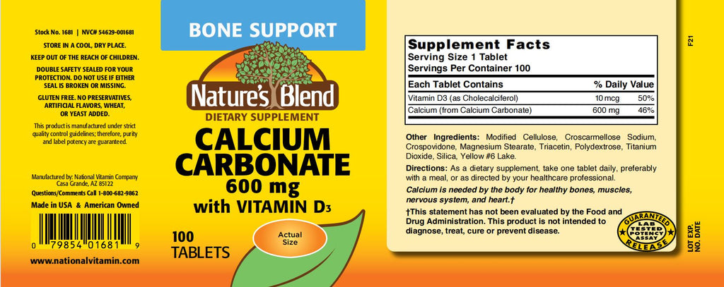 Nature's Blend, Calcium Carbonate 600 mg with Vitamin D3, 100 Tablets