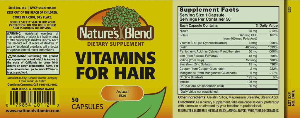 - Every Vitamins for Hair capsule by Nature’s Blend contains Niacin, Folate, Biotin, Iodine, Zinc, and other natural vitamins and nutrients.