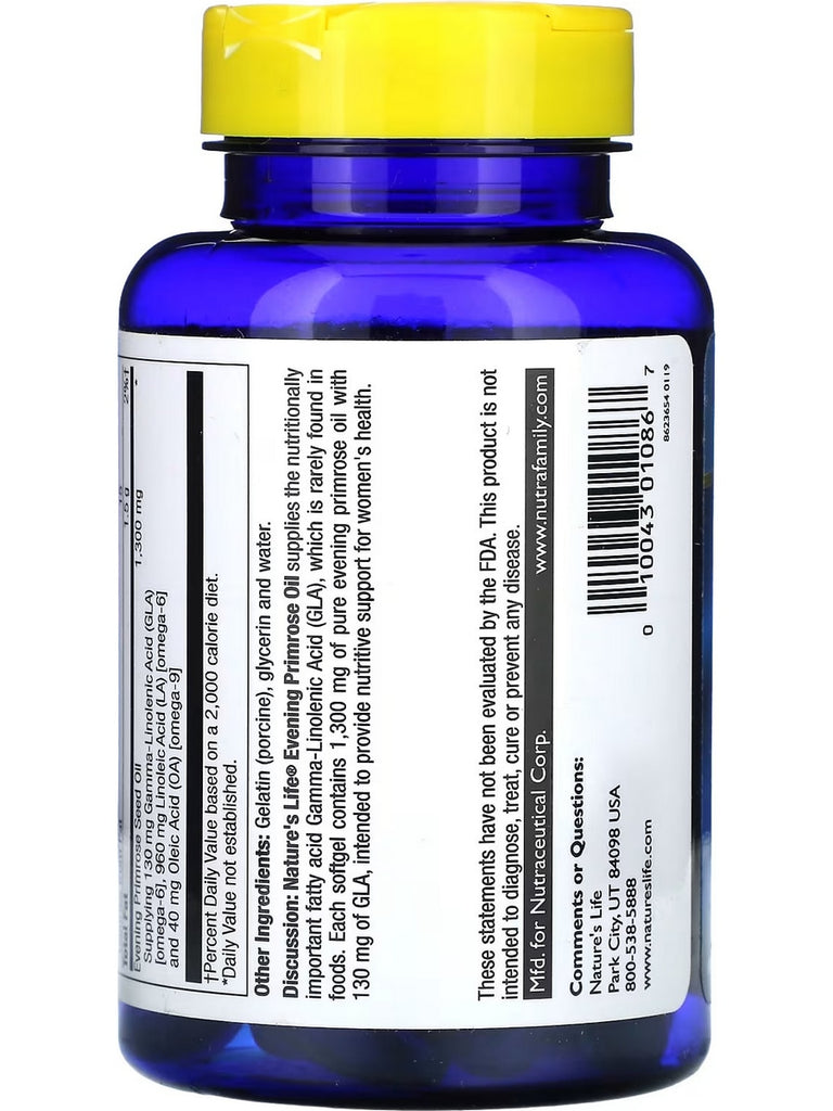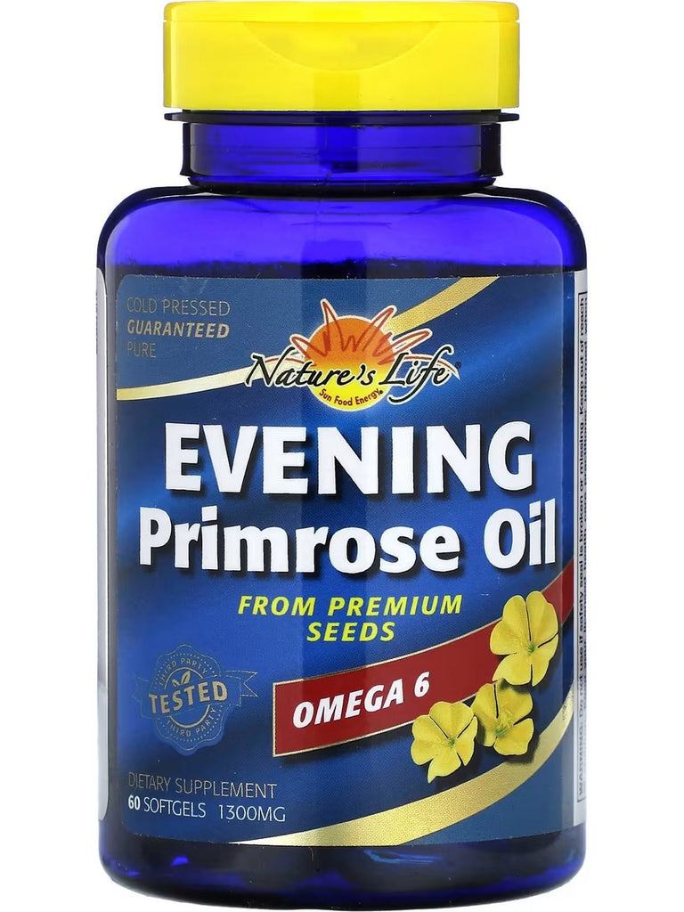 Nature's Life Evening Primrose Oil supplies the nutritionally important fatty acid Gamma-Linolenic Acid (GLA), which is rarely found in foods. Each softgel contains 1,300 of pure evening primrose oil with 130 mg of GLA, intended to provide nutritive support for women's health.