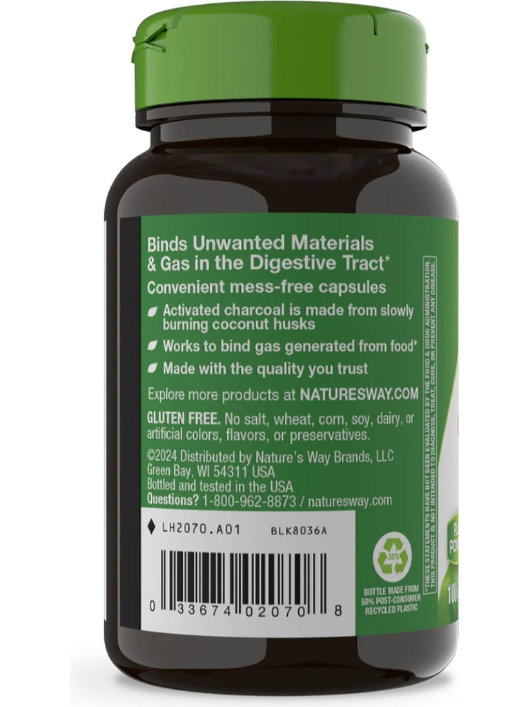 - Certified Potency. Each serving of Nature's Way Activated Charcoal contains 560 mg of charcoal. Our Activated Charcoal contains no preservatives, yeast, milk, lactose, wheat, sugar, soy, or corn.