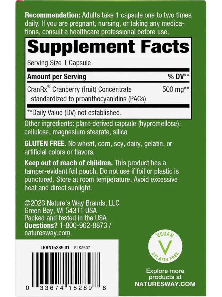 Hardworking cranberries help support urinary health in a convenient capsule form. CranRx contains a potent dose of researched cranberry fruit concentrate standardized to PACs (proanthocyanidins), the key flavonoids in cranberries. Our formula is made with premium cranberries, including the Early Black variety with a higher level of PACs. One capsule is equal to biological activity of 10 oz. cranberry juice cocktail.