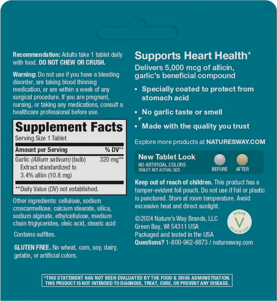 Nature's Way Garlinase 5000 is the perfect way to enjoy the rewards of fresh garlic in a convenient tablet. Garlinase 5000 delivers 5,000 mcg of allicin, fresh garlic's most beneficial compound. Allicin is the key compound in non-aged garlic that helps support cardiovascular health. Each tablet is enteric coated to survive stomach acid and reach the small intestine. Garlinase maintains heart health and also maintains healthy cholesterol levels already within the normal range.