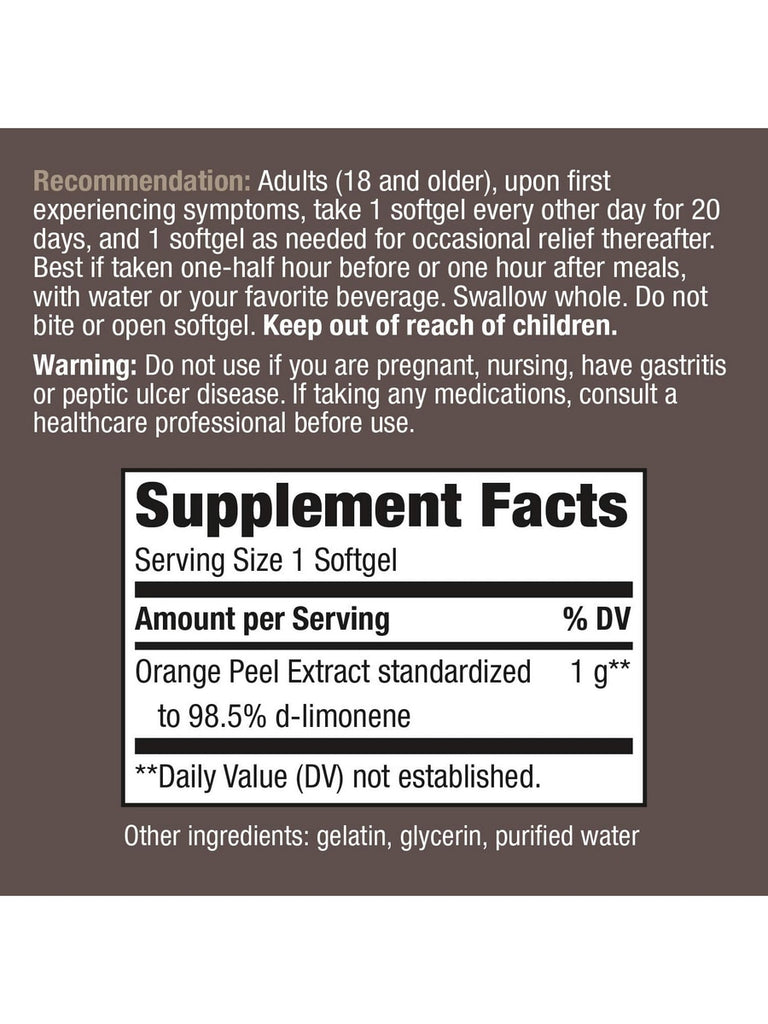 - Orange peel extract (ROH10) provides lasting relief without shutting down the production of stomach acid.
