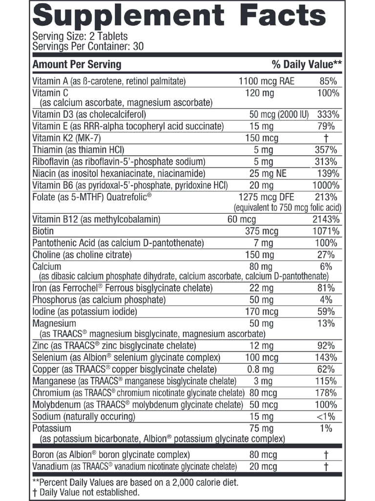 Prenatal Multivitamin tablets are designed to meet the increased nutrient needs of pregnant women, providing essential vitamins and minerals in easily absorbable forms, including vitamin B6, folate, non-constipating iron, and chelated minerals. For enhanced prenatal support, they can be combined with the award-winning Prenatal DHA.