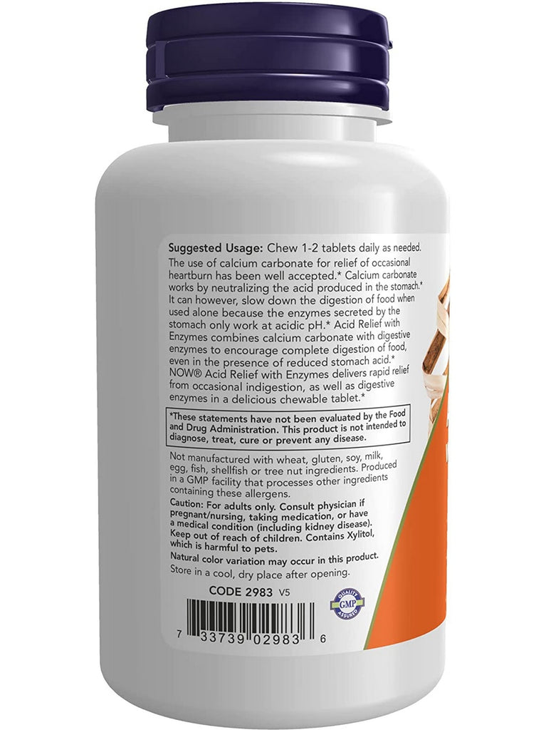 The use of calcium carbonate for relief of occasional heartburn has been well accepted. Calcium carbonate works by neutralizing the acid produced in the stomach. It can however, slow down the digestion of food when used alone because the enzymes secreted by the stomach only work at acidic pH. Acid Relief with Enzymes combines calcium carbonate with digestive enzymes to encourage complete digestion of food, even in the presence of reduced stomach acid. NOW® Acid Relief with Enzymes delivers rapid relief from occasional indigestion, as well as digestive enzymes in a delicious chewable tablet.
