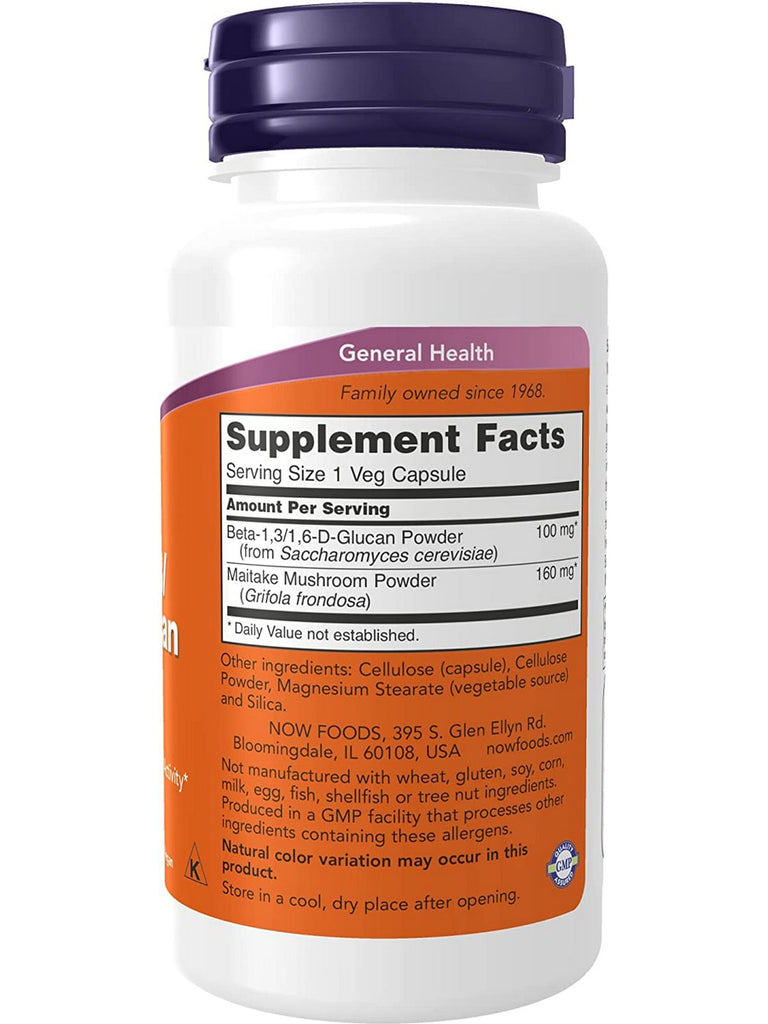 NOW® Beta-1,3/1,6-D-Glucan (Beta-Glucan) is a bioactive carbohydrate derived from the cell wall of Saccharomyces cerevisiae, commonly known as Bakers' yeast. Scientific studies have shown that yeast-derived Beta-Glucan can interact with certain immune cells, including those present in the gut-associated lymphoid tissue (GALT). The GALT exists in the intestinal tract and is known to play a critical role in healthy immune system function. NOW® Beta-Glucan is blended with Maitake Mushrooms for complementary support.
