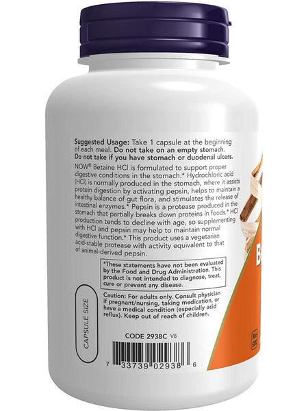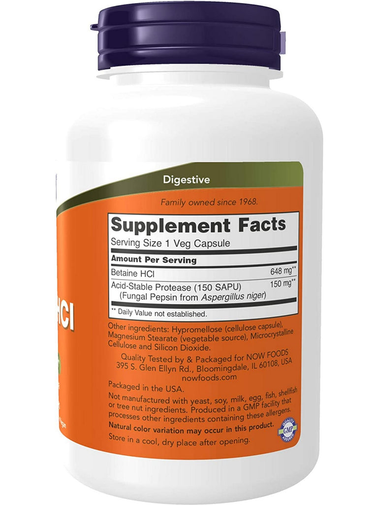 NOW® Betaine HCl is formulated to support proper digestive conditions in the stomach. Hydrochloric acid (HCl) is normally produced in the stomach, where it assists protein digestion by activating pepsin, helps to maintain a healthy balance of gut flora, and stimulates the release of intestinal enzymes. Pepsin is a protease produced in the stomach that partially breaks down proteins in foods. HCl production tends to decline with age, so supplementing with HCl and pepsin may help to maintain normal digestive function. This product uses a vegetarian acid-stable protease with activity equivalent to that of animal-derived pepsin.