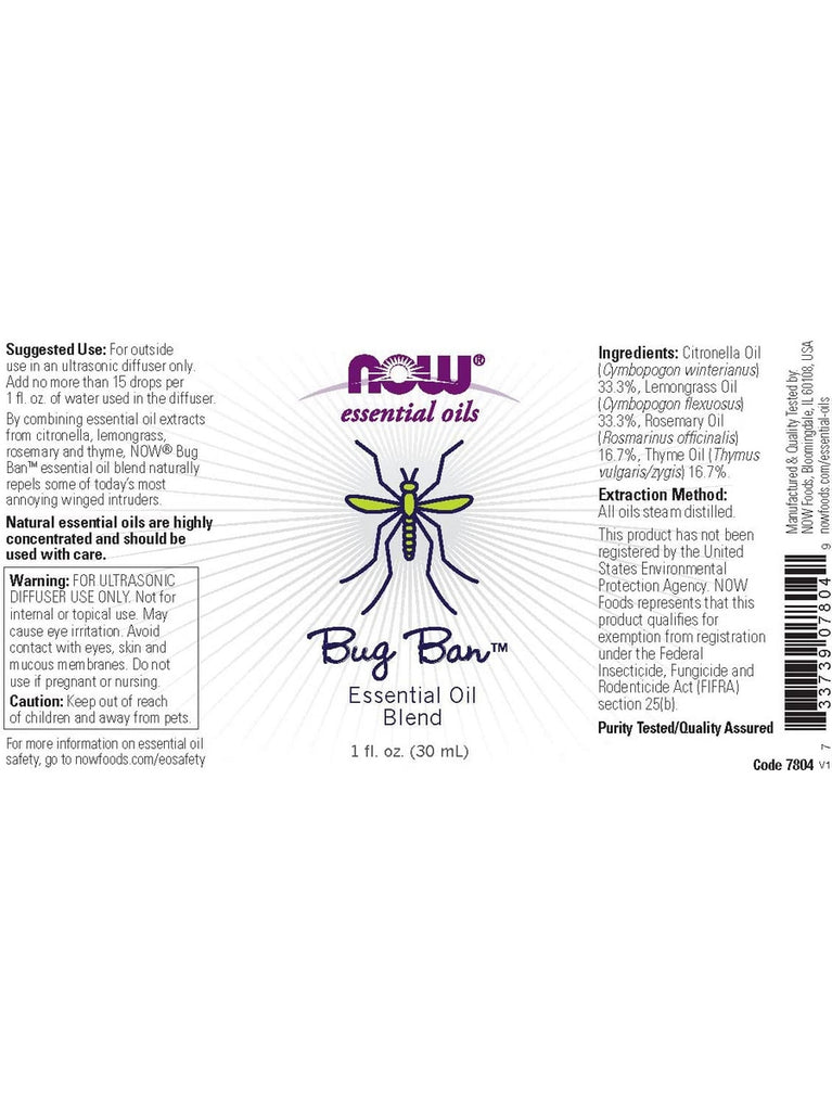 By combining essential oil extracts from citronella, lemongrass, rosemary and thyme, NOW® Bug Ban™ essential oil blend naturally repels some of today’s most annoying winged intruders.