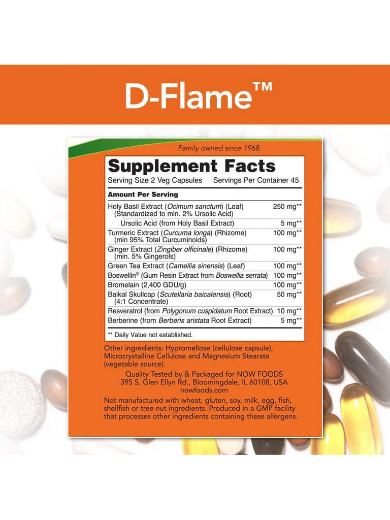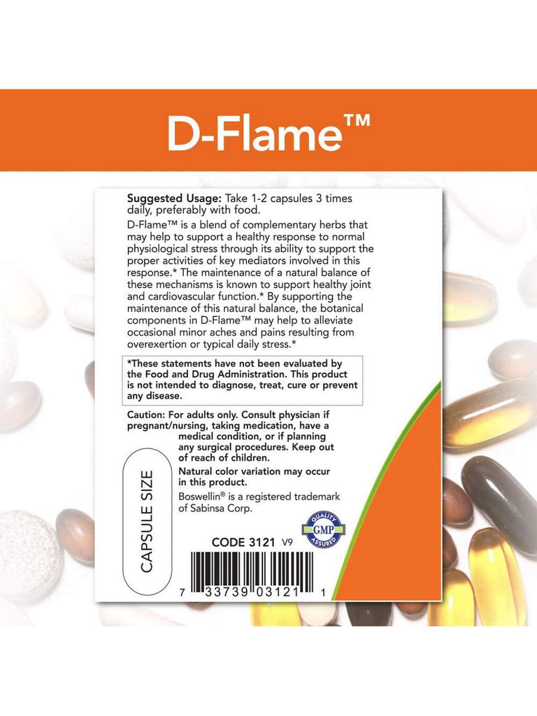 D-Flame™ is a blend of complementary herbs that may help to support a healthy response to normal physiological stress through its ability to support the proper activities of key mediators involved in this response. The maintenance of a natural balance of these mechanisms is known to support healthy joint and cardiovascular function. By supporting the maintenance of this natural balance, the botanical components in D-Flame™ may help to alleviate occasional minor aches and pains resulting from overexertion or typical daily stress.
