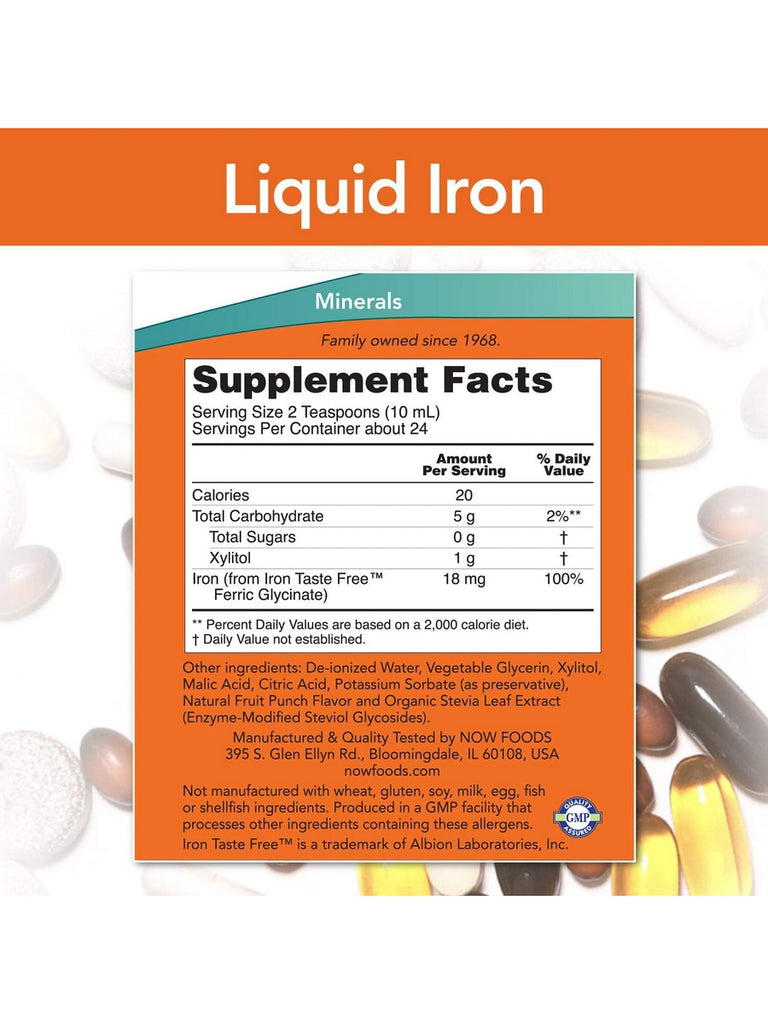 Iron is an essential mineral that plays central roles in energy production, immune system function, and neurological health. Iron is an essential component of hemoglobin, a molecule that transports oxygen to the cells of the body, and myoglobin, which binds oxygen used in muscle tissues. NOW uses Iron Taste Free™ Ferric Glycinate, which has clinically demonstrated superior absorption and is well tolerated because it is gentle and non-constipating.