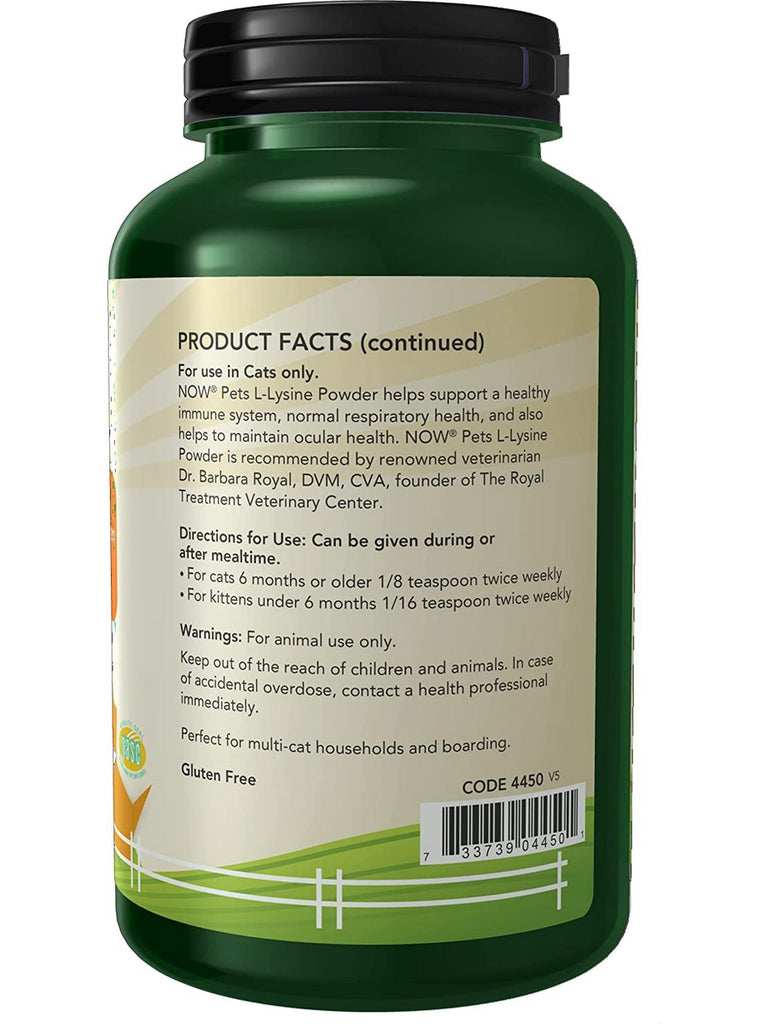 NOW® Pets L-Lysine Powder helps support a healthy immune system, normal respiratory health, and also helps to maintain ocular health. NOW® Pets L-Lysine Powder is recommended by renowned veterinarian Dr. Barbara Royal, DVM, CVA, founder of the Royal Treatment Veterinary Center.