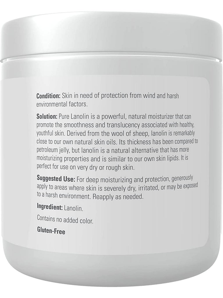 Solution: Pure Lanolin is a powerful, natural moisturizer that can promote the smoothness and translucency associated with healthy, youthful skin. Derived from the wool of sheep, lanolin is remarkably close to our own natural skin oils. Its thickness has been compared to petroleum jelly, but lanolin is a natural alternative that has more moisturizing properties and is similar to our own skin lipids. It is perfect for use on very dry or rough skin.
