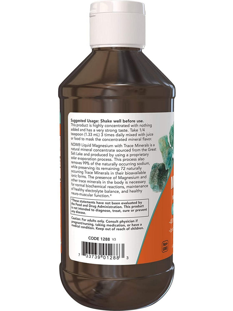 NOW® Liquid Magnesium with Trace Minerals is a natural mineral concentrate sourced from the Great Salt Lake and produced by using a proprietary solar evaporation process. This process also removes 99% of the naturally occurring sodium, while preserving its remaining 72 naturally occurring Trace Minerals in their bioavailable ionic forms. The presence of Magnesium and other trace minerals in the body is necessary for normal biochemical reactions, maintenance of healthy electrolyte balance, and healthy neuro-muscular function.