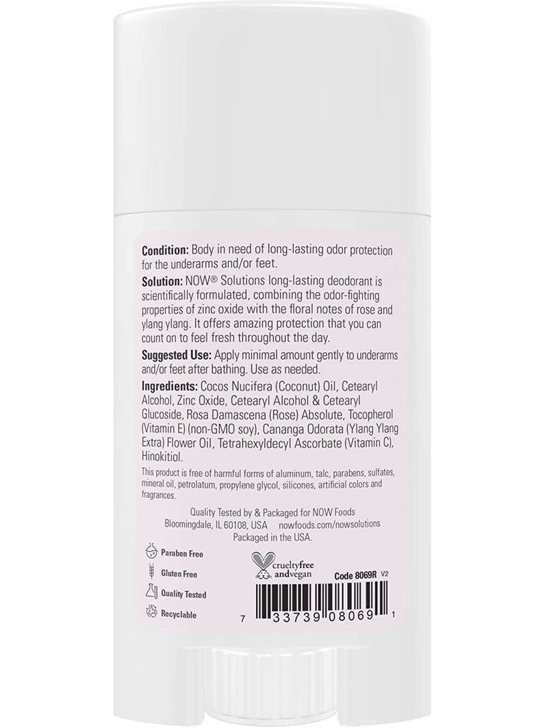 Solution: NOW® Solutions long-lasting deodorant is scientifically formulated, combining the odor-fighting properties of zinc oxide with the floral notes of rose and ylang ylang. It offers amazing protection that you can count on to feel fresh throughout the day.