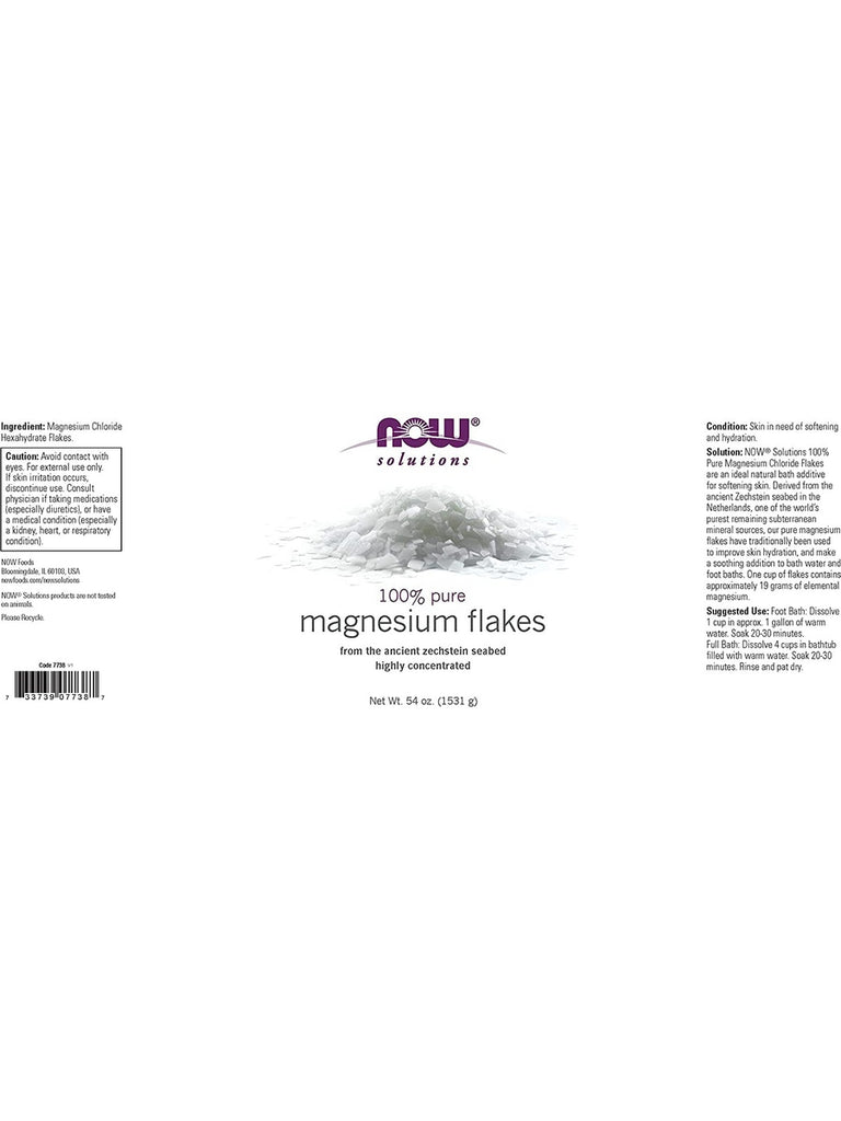 Solution: NOW® Solutions 100% Pure Magnesium Chloride Flakes are an ideal natural bath additive for softening skin. Derived from the ancient Zechstein seabed in the Netherlands, one of the world’s purest remaining subterranean mineral sources, our pure magnesium flakes have traditionally been used to improve skin hydration, and make a soothing addition to bath water and foot baths. One cup of flakes contains approximately 19 grams of elemental magnesium.