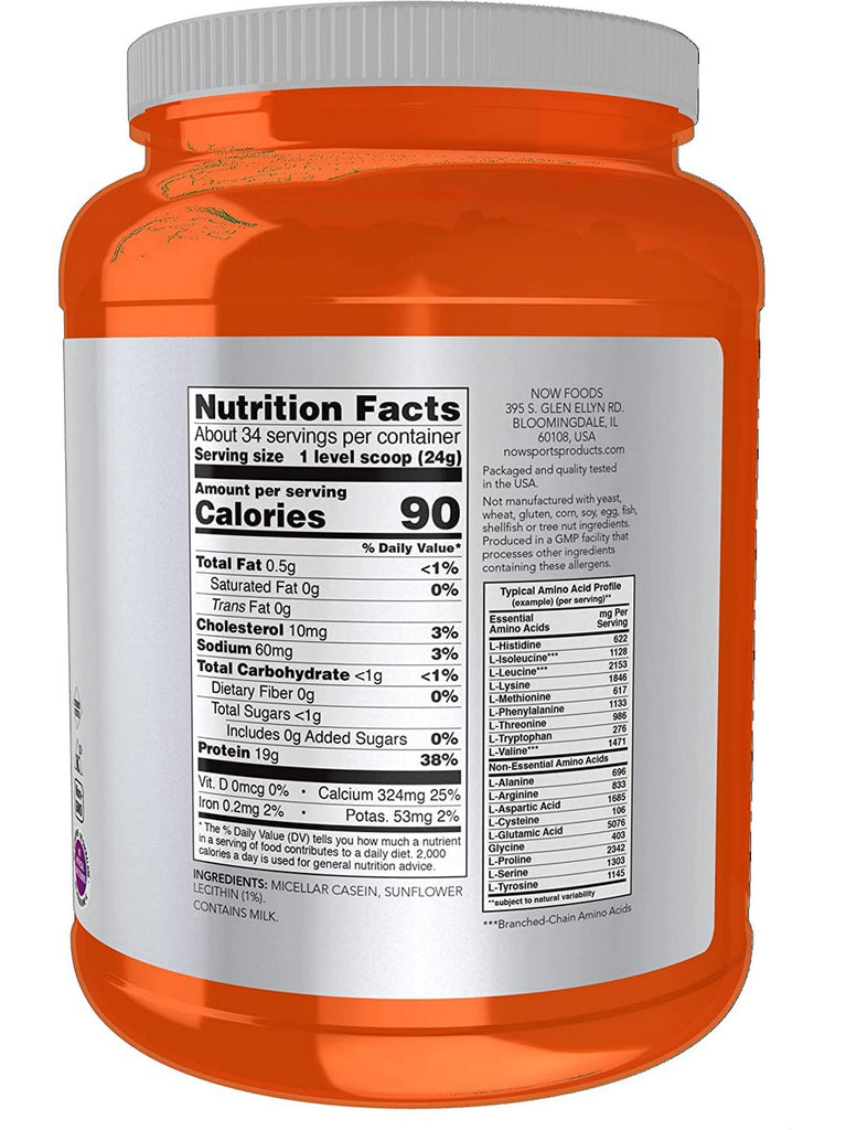 Micellar casein is a slowly digested, complete protein, with an excellent amino acid profile that typically has over 4,500 mg of branched-chain amino acids per 1 scoop serving. Because micellar casein thickens in the low pH of the stomach, slowing down its entry into the intestines, its amino acids are released in a sustained manner. Slower digestion ensures continuous availability of amino acids for the body. NOW® Micellar Casein mixes easily in your favorite beverage and is an ideal choice for sustained protein support.
