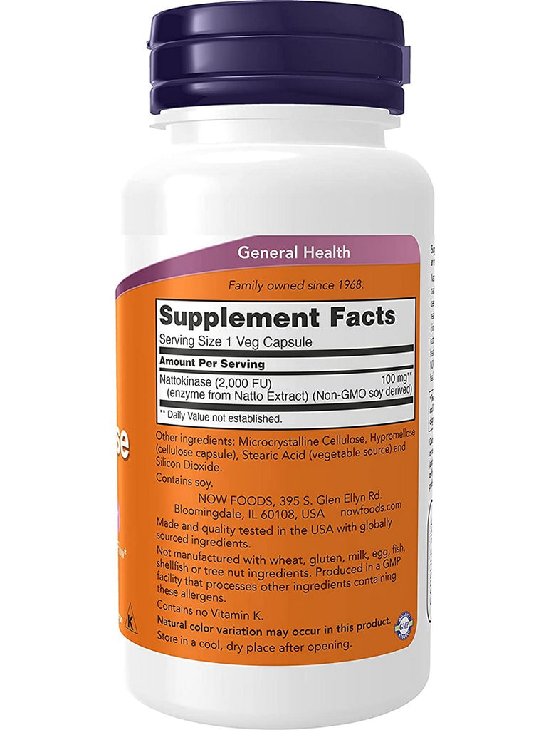 Nattokinase is an enzyme isolated from natto, a traditional Japanese fermented soy food. Natto has been consumed for thousands of years for its numerous health promoting properties. More recently, both clinical and non-clinical studies have demonstrated that nattokinase can help to promote heart and circulatory health by supporting normal blood clotting functions. NOW® Nattokinase is derived from non-GMO soy and has 2,000 FUs (Fibrinolytic Units) per 100 mg serving.