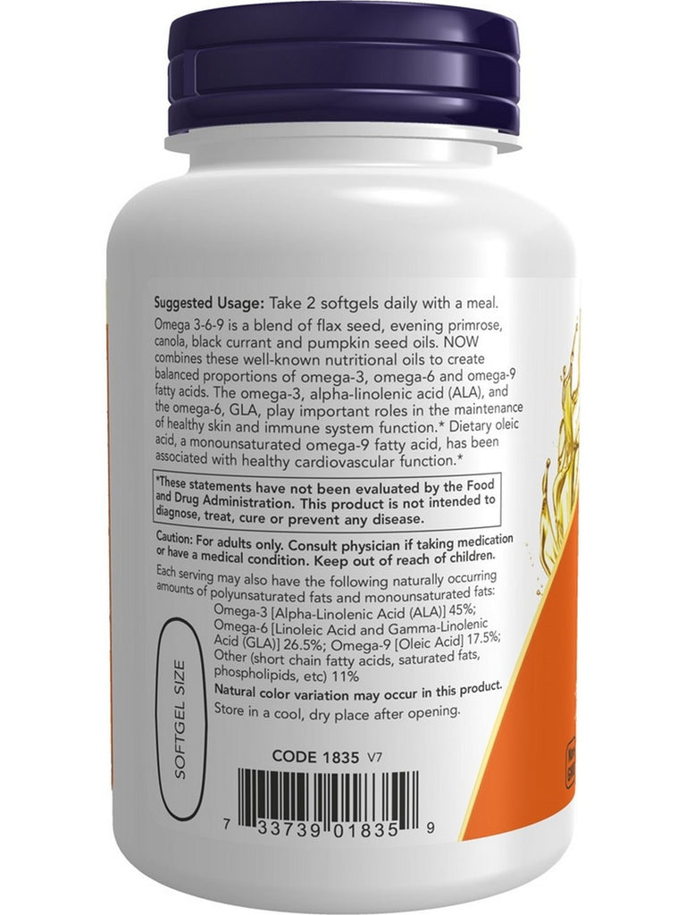 Omega 3-6-9 is a blend of Flax Seed, Evening Primrose, Canola, Black Currant and Pumpkin Seed Oils. NOW combines these well-known nutritional oils to create balanced proportions of Omega-3, Omega-6 and Omega-9 fatty acids. The Omega-3, Alpha Linolenic Acid (ALA), and the Omega-6, GLA, play important roles in the maintenance of healthy skin and immune system function. Dietary Oleic Acid, a monounsaturated Omega-9 fatty acid, has been associated with healthy cardiovascular function.