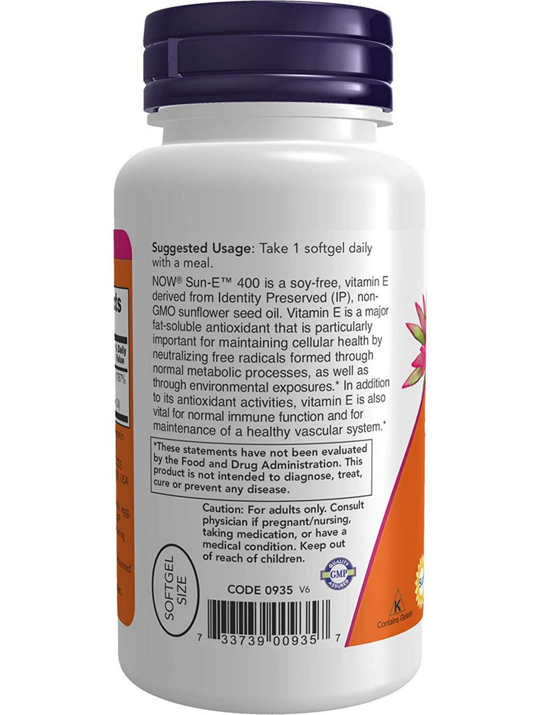 NOW® Sun-E™ 400 is a soy-free, vitamin E derived from Identity Preserved (IP), non-GMO sunflower seed oil. Vitamin E is a major fat-soluble antioxidant that is particularly important for maintaining cellular health by neutralizing free radicals formed through normal metabolic processes, as well as through environmental exposures. In addition to its antioxidant activities, vitamin E is also vital for normal immune function and for maintenance of a healthy vascular system.