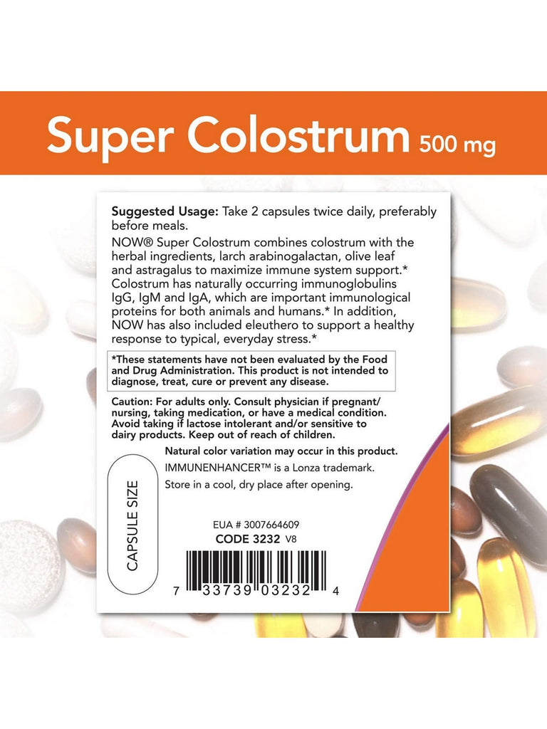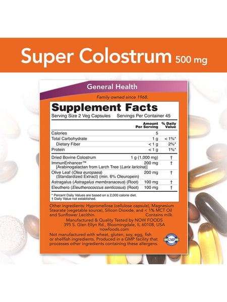NOW® Super Colostrum combines colostrum with the herbal ingredients, larch arabinogalactan, olive leaf and astragalus to maximize immune system support. Colostrum has naturally occurring immunoglobulins IgG, IgM and IgA, which are important immunological proteins for both animals and humans. In addition, NOW has also included eleuthero to support a healthy response to typical, everyday stress.