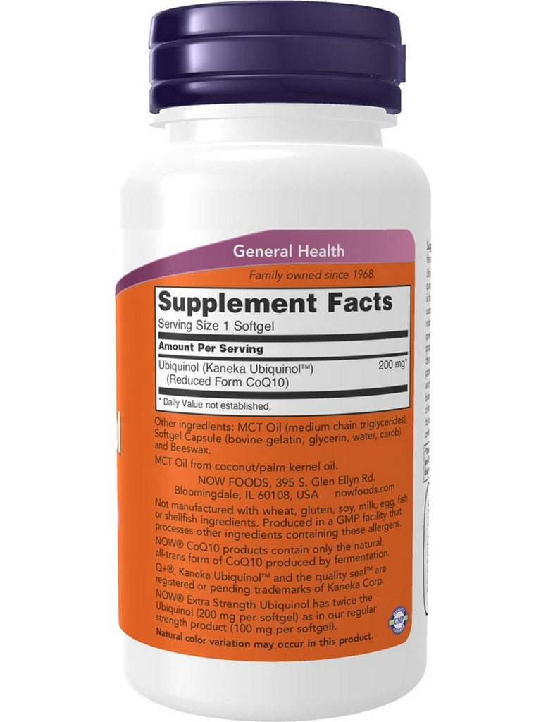 NOW® Extra Strength Ubiquinol has twice the Ubiquinol (200 mg per softgel) as in our regular strength product (100 mg per softgel).
