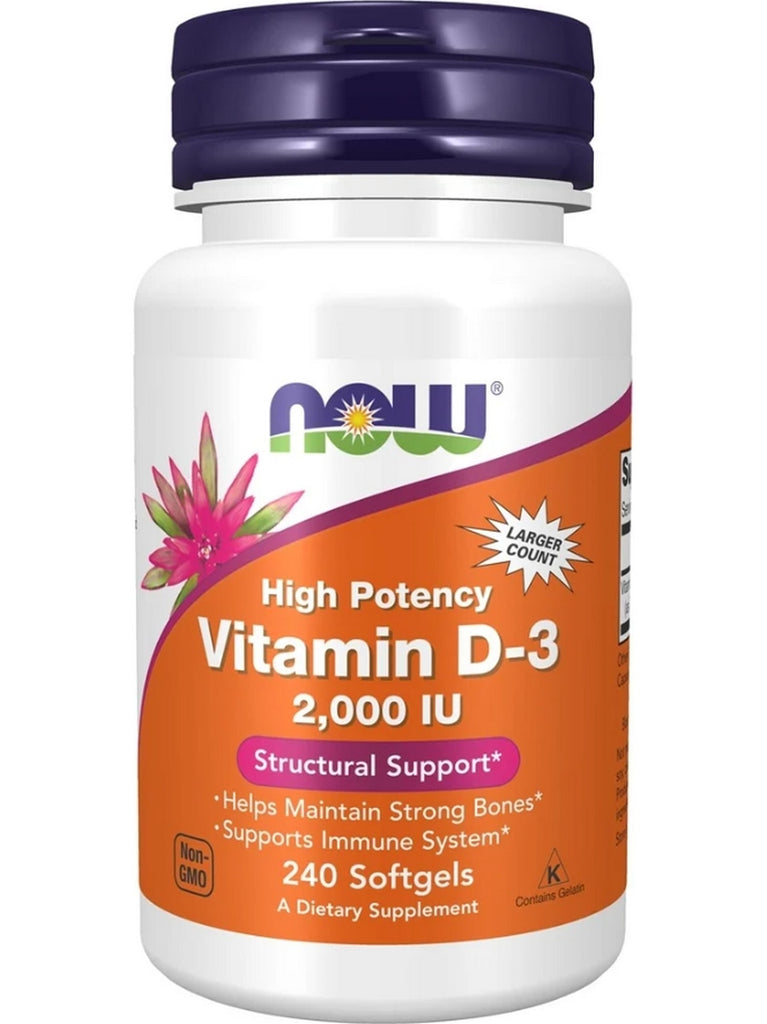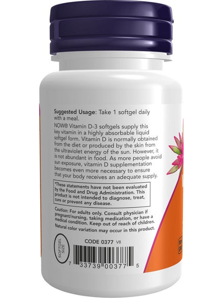 NOW® Vitamin D-3 softgels supply this key vitamin in a highly absorbable liquid softgel form. Vitamin D is normally obtained from the diet or produced by the skin from the ultraviolet energy of the sun. However, it is not abundant in food. As more people avoid sun exposure, vitamin D supplementation becomes even more necessary to ensure that your body receives an adequate supply.