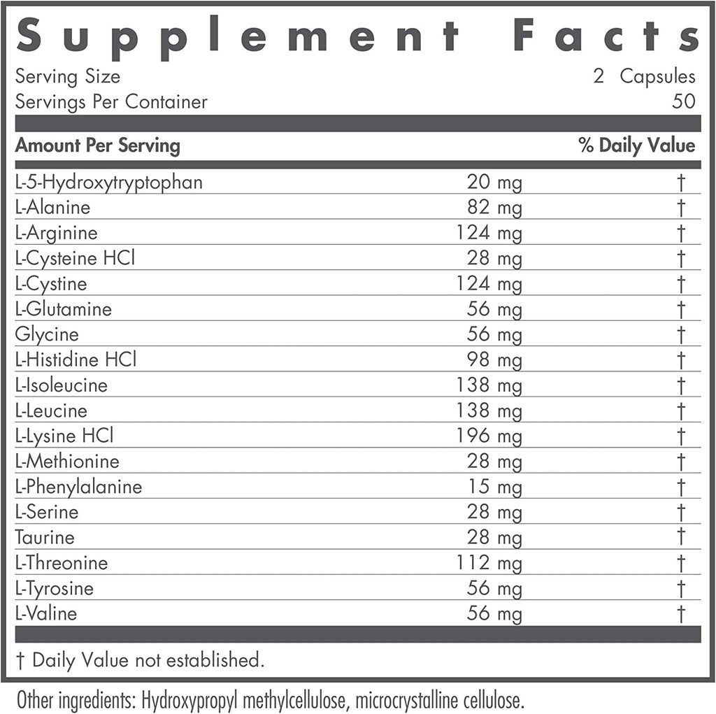 A formulation of 17 naturally occurring amino acids in their free forms, including 9 essential amino acids, as well as L-5-Hydroxytryptophan (5-HTP).