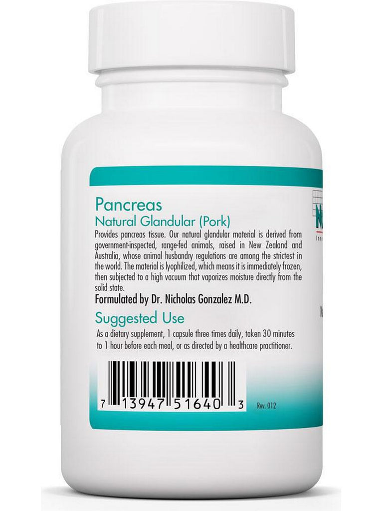 Provides pancreas tissue. Properly prepared pancreas glandular substance contains amylase, protease, and lipase, as well as other digestive factors naturally occurring in the pancreas. Pancreas Natural Glandular products from pork and lamb can be used in a dietary rotation plan by those who are highly sensitive.