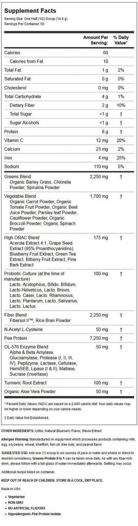 Mix one (1) scoop (14.6 g) in 6-10 ounces of cold beverage of choice. Greens 8 in 1 with Protein can be taken once daily. As with any fiber rich drink, always follow each serving with a full glass of water. Settling may occur.