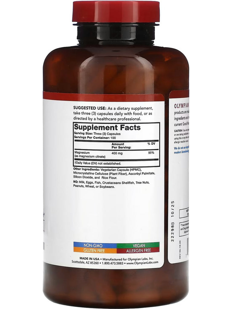 Olympian Labs, Magnesium Citrate, 400 mg, 300 Vegetarian Capsules