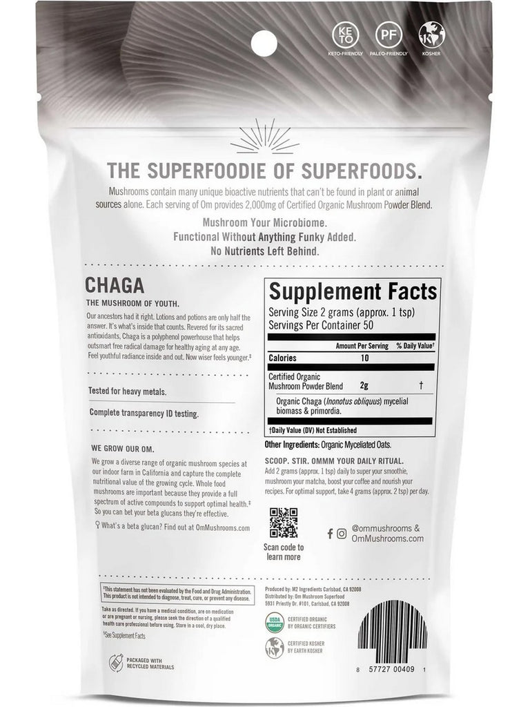 Om Mushroom Superfood, Chaga Certified Organic Mushroom Powder, 3.5 oz
