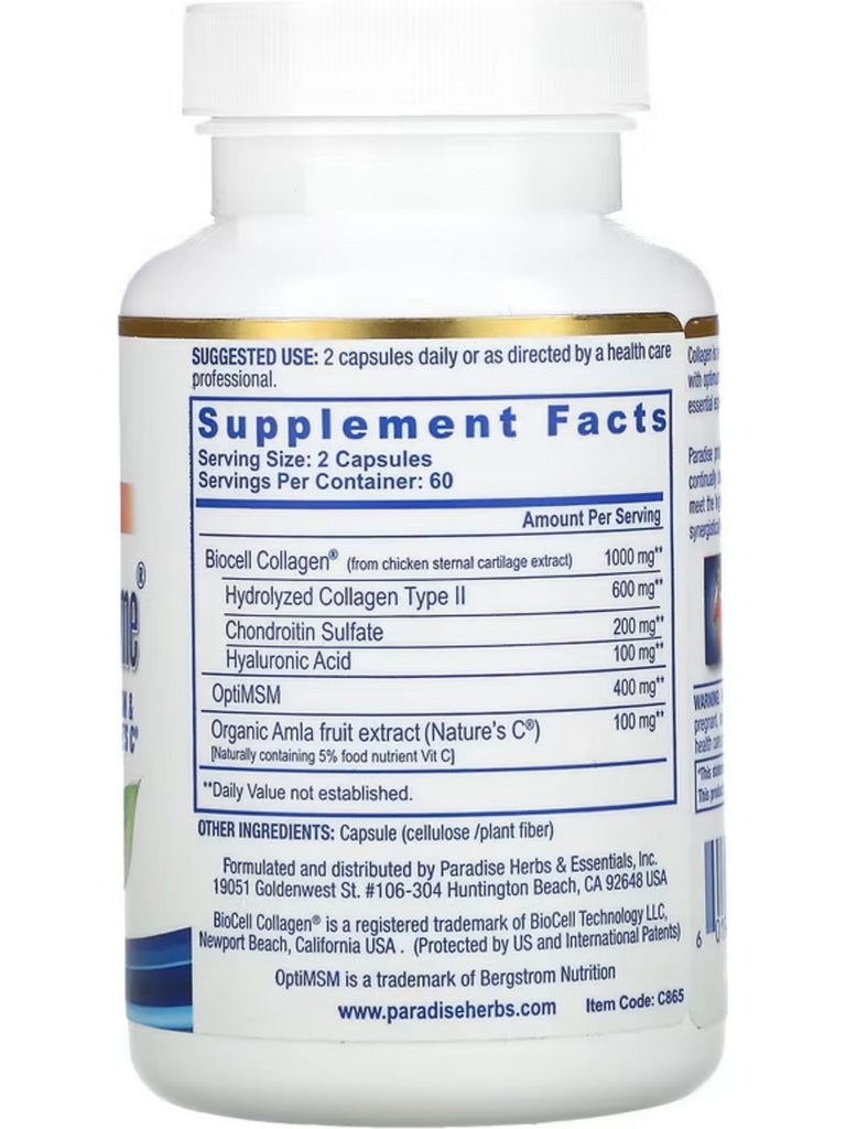 Paradise Collagen Essence uses patented BioCell Collagen synergized with our Natures C and poly 25 ( He Shou Wu formula) for optimal support for the joints, hair and skin. BioCell Collagen is a more expensive and rarer type II collagen sourced from chicken sternal cartilage. It does not contain Cow or Pig. It naturally provides bioavailable hyaluronic acid, (partly responsible for the skin’s moisture, suppleness and elasticity).Chondroitin Sulfate, and small amounts of glucosamine. Our Natures C is sourced from quality amla fruits and our Poly 25 Shou Wu formula is based on traditional herbs that have been used for thousands of years to support healthy hair, skin, joints, back and knees.