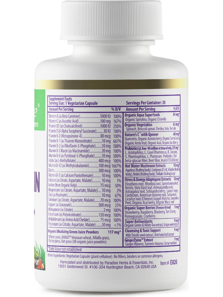 Bursting with over 48 ingredients Paradise award-winning ORAC-Energy Earth’s Blend is truly a Nature Synergized™ superfood multivitamin. Our formula uses real whole-food goodness paired with vitamins, minerals, probiotics, and herbs to go beyond mere deficiencies and help support overall whole system health. It’s not just how many ingredients are in your multiple, its what it can do that makes the difference. Earth’s Blend is tested using state of the art technology to actually prove its powerful antioxidant activity. Each capsule is over 4,000 ORAC giving you the antioxidant power of over 7 servings of fruits and vegetables in every capsule, making it quite possibly (in our humble opinion) the best multivitamin on the PLANET!