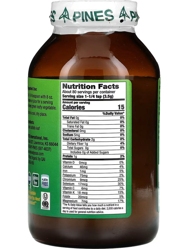 Its deep green hue is a testament to its superior quality. Embrace wellness and experience the power of Pines Alfalfa Powder today!