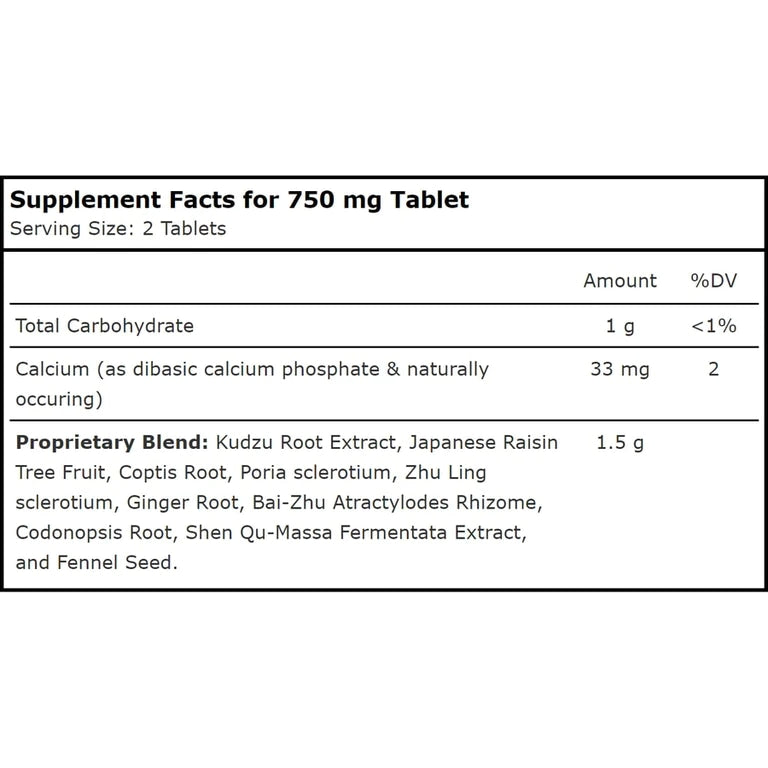 Proprietary Blend: Kudzu Root Extract, Japanese Raisin Tree Fruit, Coptis Root, Poria sclerotium, Zhu Ling sclerotium, Ginger Root, Bai-Zhu Atractylodes Rhizome, Codonopsis Root, Shen Qu-Massa Fermentata Extract, and Fennel Seed. 1.5 g