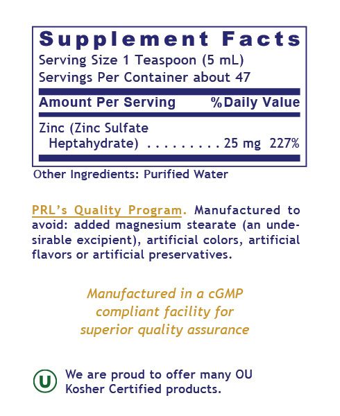 To use as a zinc test: hold 1 teaspoon in the mouth for 15 seconds. If an immediate perception of taste occurs, the person may have an adequate zinc status. If a lack of taste or delay in taste perception occurs, it may indicate a zinc deficiency. Liquid Zinc Ultra may be swallowed after testing.