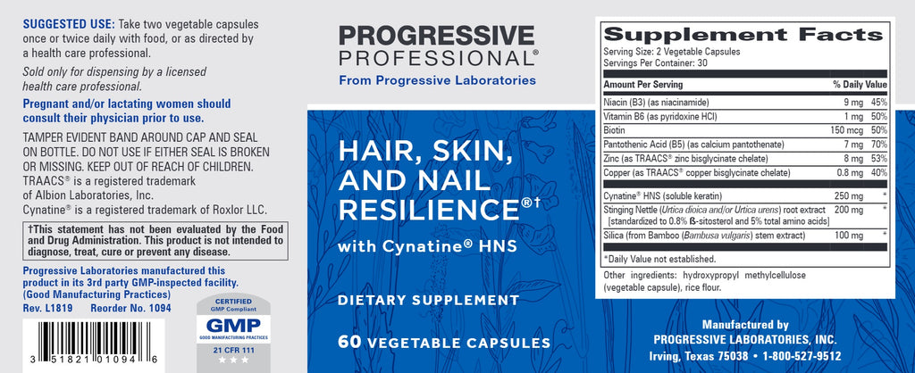 Progressive Labs, Hair, Skin and Nail Resilience with Cynatine HNS, 60 Vegetable Capsules
