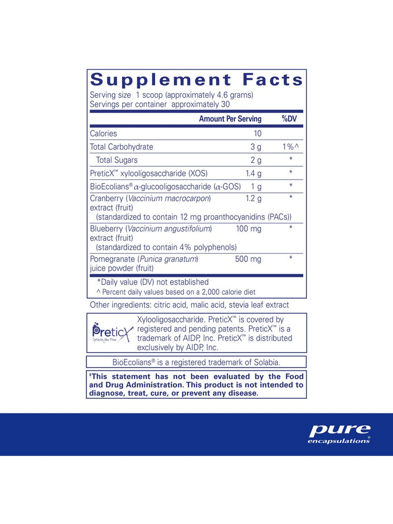The polyphenols in this great-tasting powder supplement are derived from pomegranate, cranberry and blueberry, supporting the growth of lactobacilli and bifidobacterium in the colon as well as the GI tract, for cellular health. As the polyphenols pass through the G.I. tract, their bioavailability is enhanced, and they can support healthy gut microbial composition.