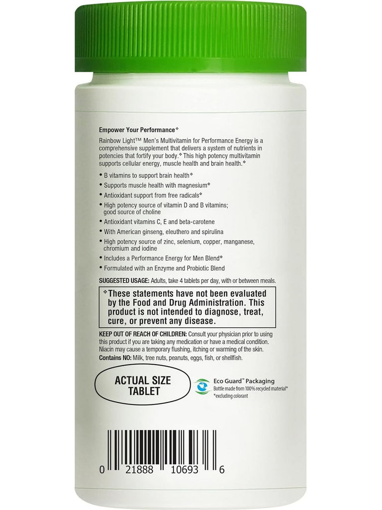Rainbow Light Men's Multivitamin for Performance Energy is a comprehensive supplement that delivers a system of nutrients in potencies that fortify your body. This high potency multivitamin supports cellular energy, muscle health and brain health.