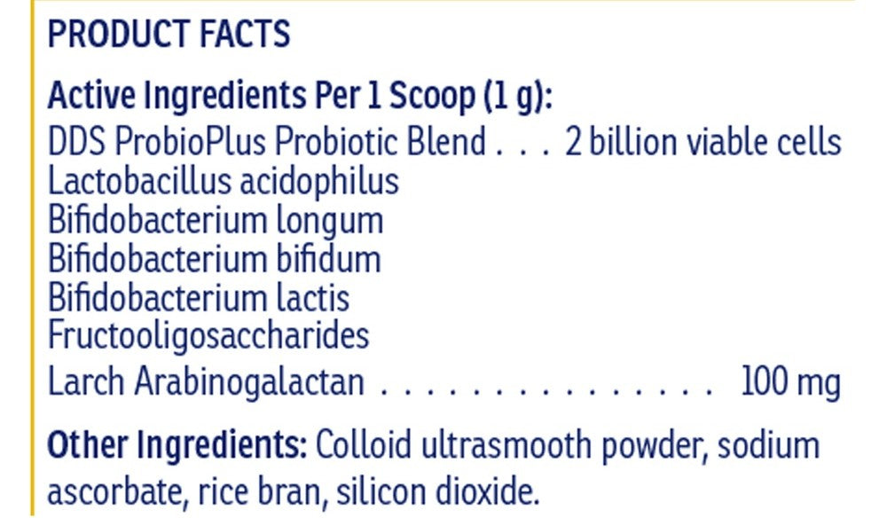 Rx Biotic is a blend of 4 major probiotic bacterial strains with two prebiotics: fructooligosaccharides and larch arabinogalactan. Clinical research has demonstrated that the beneficial bacteria in the bowel normalize gastrointestinal system function as well as contribute to improved immune response. Rx Biotic is delivered in a highly palatable, high potency powder with no flavorings. A 1/8 teaspoon scoop has been included for ease of dispensing.