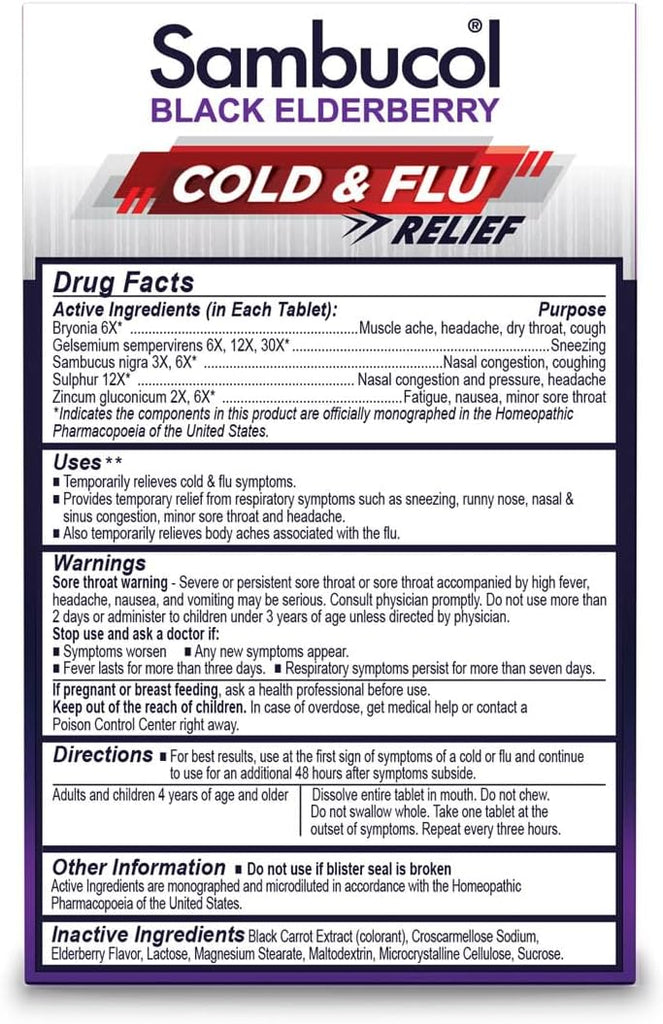 Cold, flu, aches, and fever? Get fast, temporary relief from 6 cold and flu symptoms with Sambucol Black Elderberry Homeopathic Cold & Flu Relief Tablets. Take at the first sign of symptoms to help relieve nasal and sinus congestion, fever and chills, runny nose, sore throat, headache, and cough. The quick-dissolve tablets melt in your mouth without water to help you feel better.