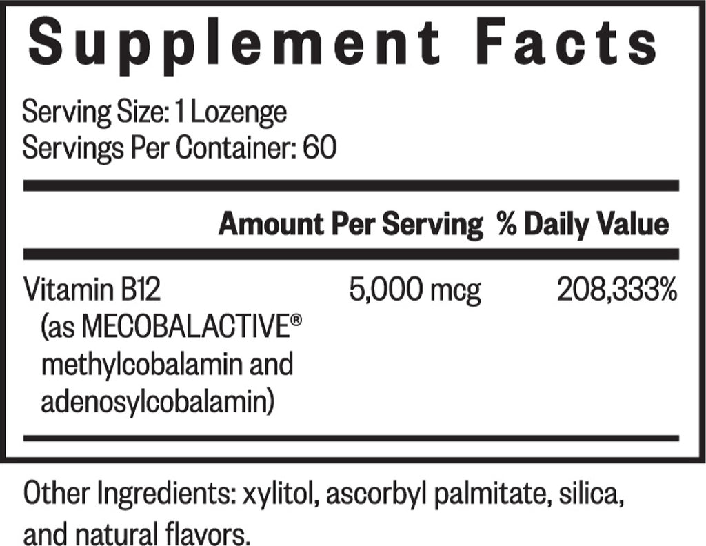Methyl B12 5000 provides a potent dose of bioavailable vitamin B12 in a delicious, well-absorbed lozenge. Each serving contains a 5,000 mcg mixture of methylcobalamin and adenosylcobalamin.