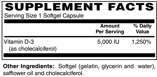 Smart Herbs Vitamin D-3 formula is an essential source of Vitamin D-3, the sunshine vitamin. Vitamin D is a fat soluble nutrient that is produced by your skin in response to sunlight. Unfortunately, most of us are unable or unwilling to be exposed to enough sunlight for adequate Vitamin D production, leaving our body's deprived of this important vitamin. Fortunately, certain foods and supplements may be used on a daily basis to replenish adquate Vitamin D levels, which are vital for bone and dental health as well as immune protection. Smart Herbs Vitamin D-3 contains 5,000 IU per serving of Vitamin D, representing 1,250% of the daily value in an easy to swallow softgel.