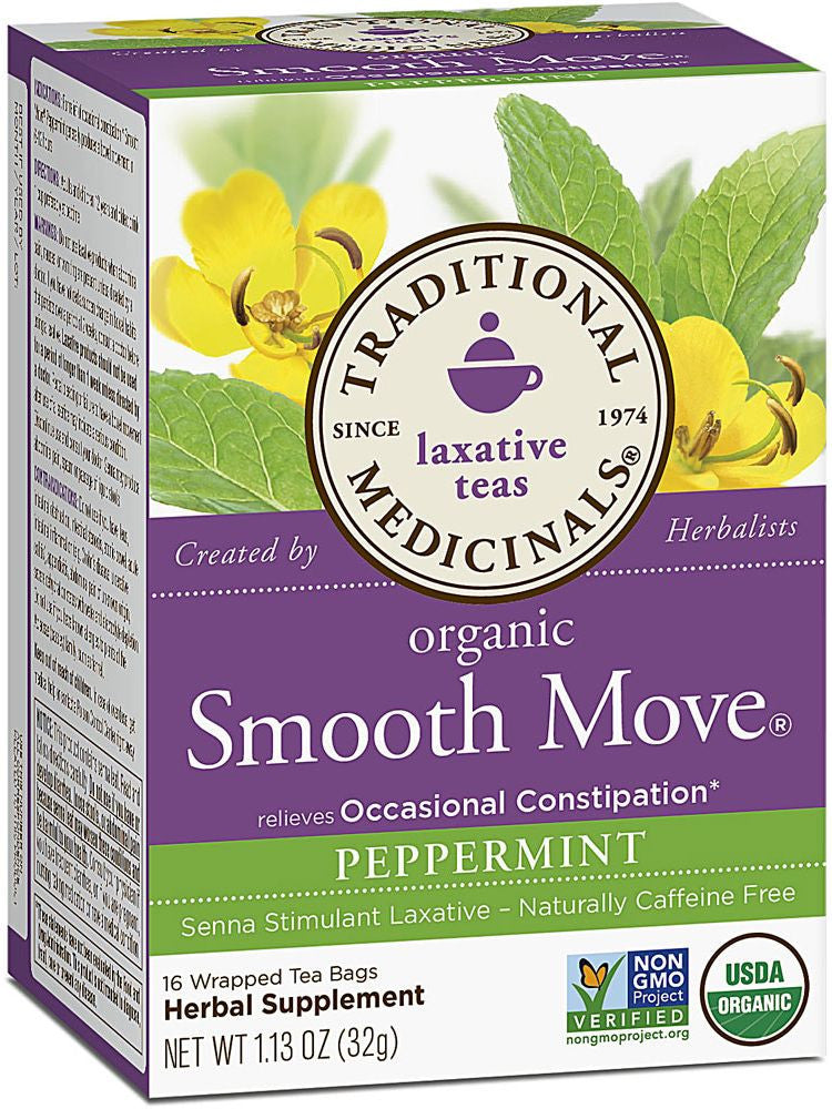 Traditional Medicinals Smooth Move Herbal Tea Stimulant Laxative Caffeine Free with Senna Peppermint contains peppermint, licorice and fennel that are traditionally combined with senna to ease discomfort and reduce the potential for unpleasant feeling, such as cramping. Traditional Medicinals Smooth Move Peppermint is pleasantly aromatic and bittersweet.