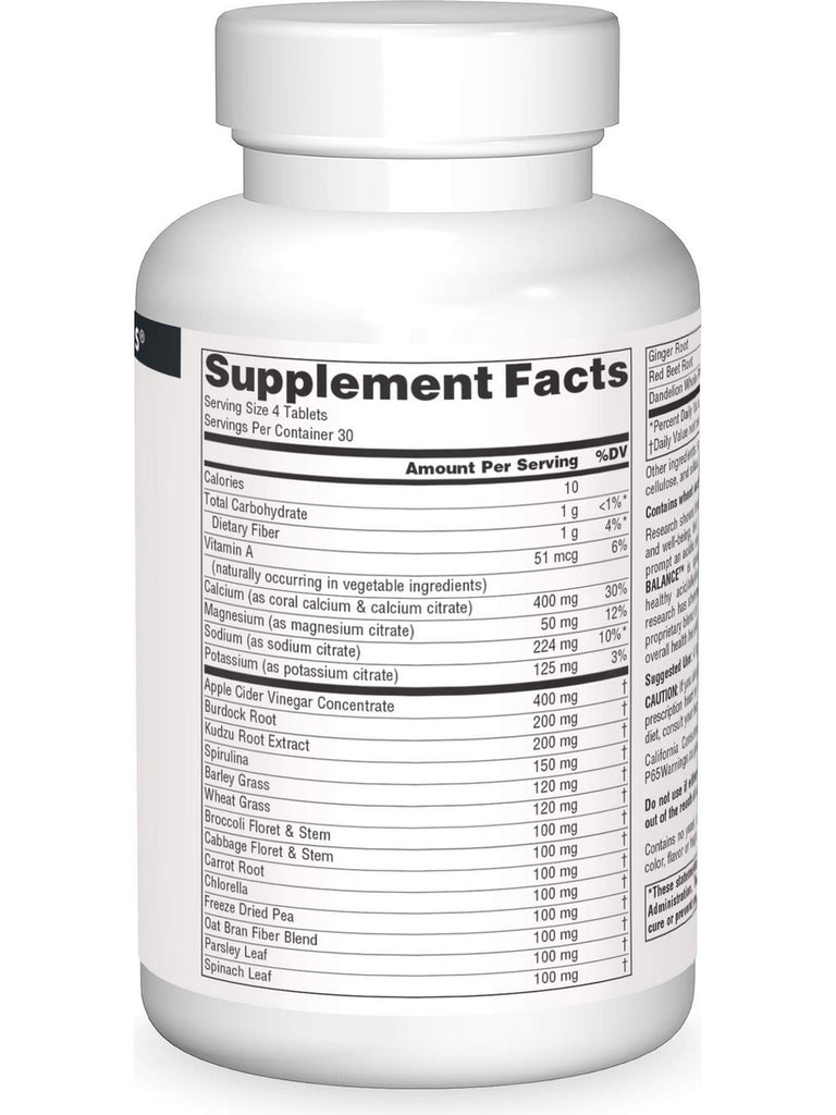 Research shows that a more alkaline pH diet promotes general health and well-being, but many of us don't realize that our modern diets can prompt an acidic shift in urinary pH levels. Source Naturals Alkaline Balance™ is specifically designed to aid the body in supporting healthy acid/alkaline balance. It contains mineral citrates, which research has shown to be alkalinizing, as well as coral calcium and a proprietary blend of herbs and green food powders that complement the overall health benefits of the product.